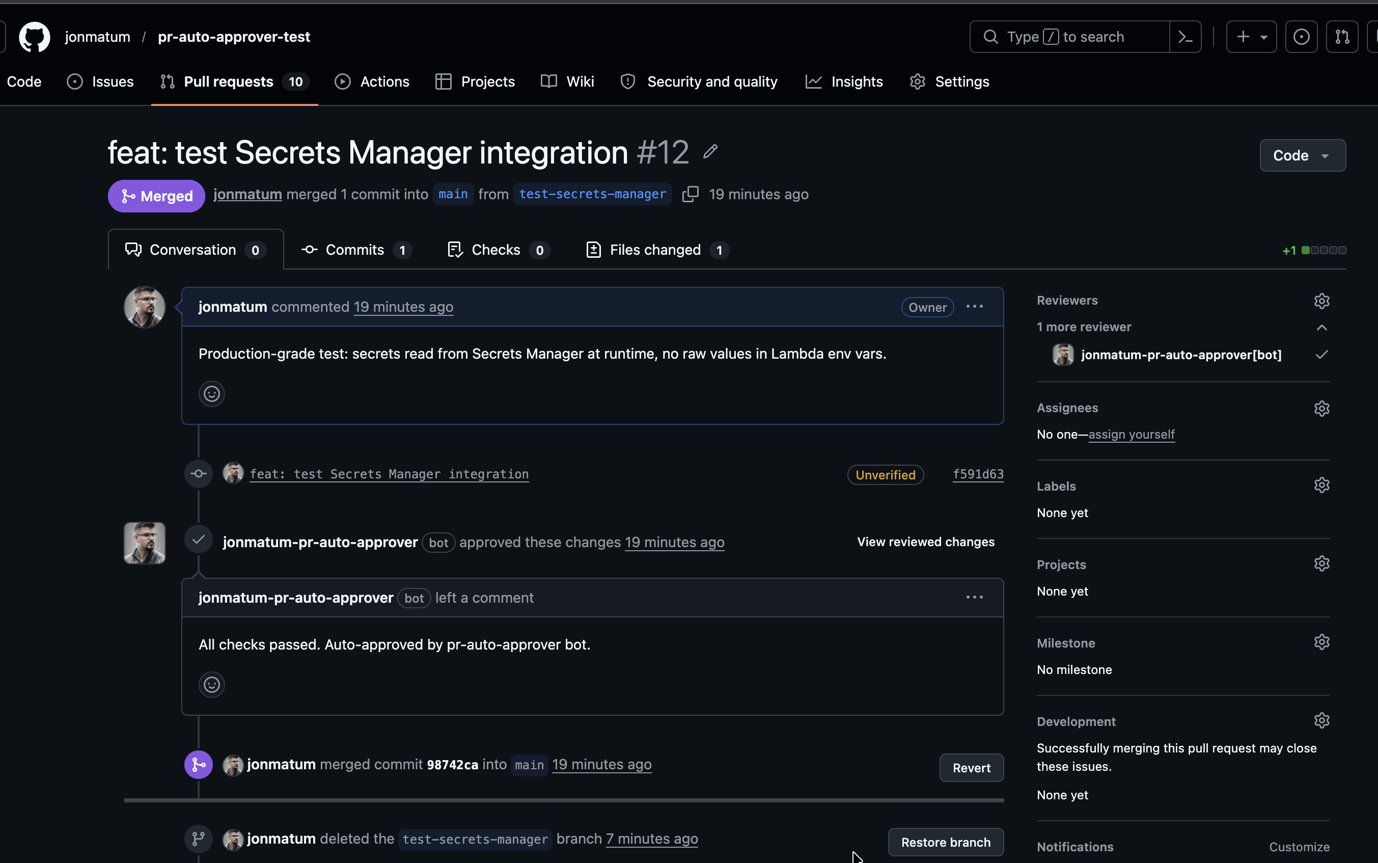 El screenshot muestra el flujo completo en el repositorio de prueba: el owner comenta sobre la integración con Secrets Manager, el bot aprueba automáticamente con «All checks passed. Auto-approved by pr-auto-approver bot.», y el PR se mergea — todo en menos de un minuto.