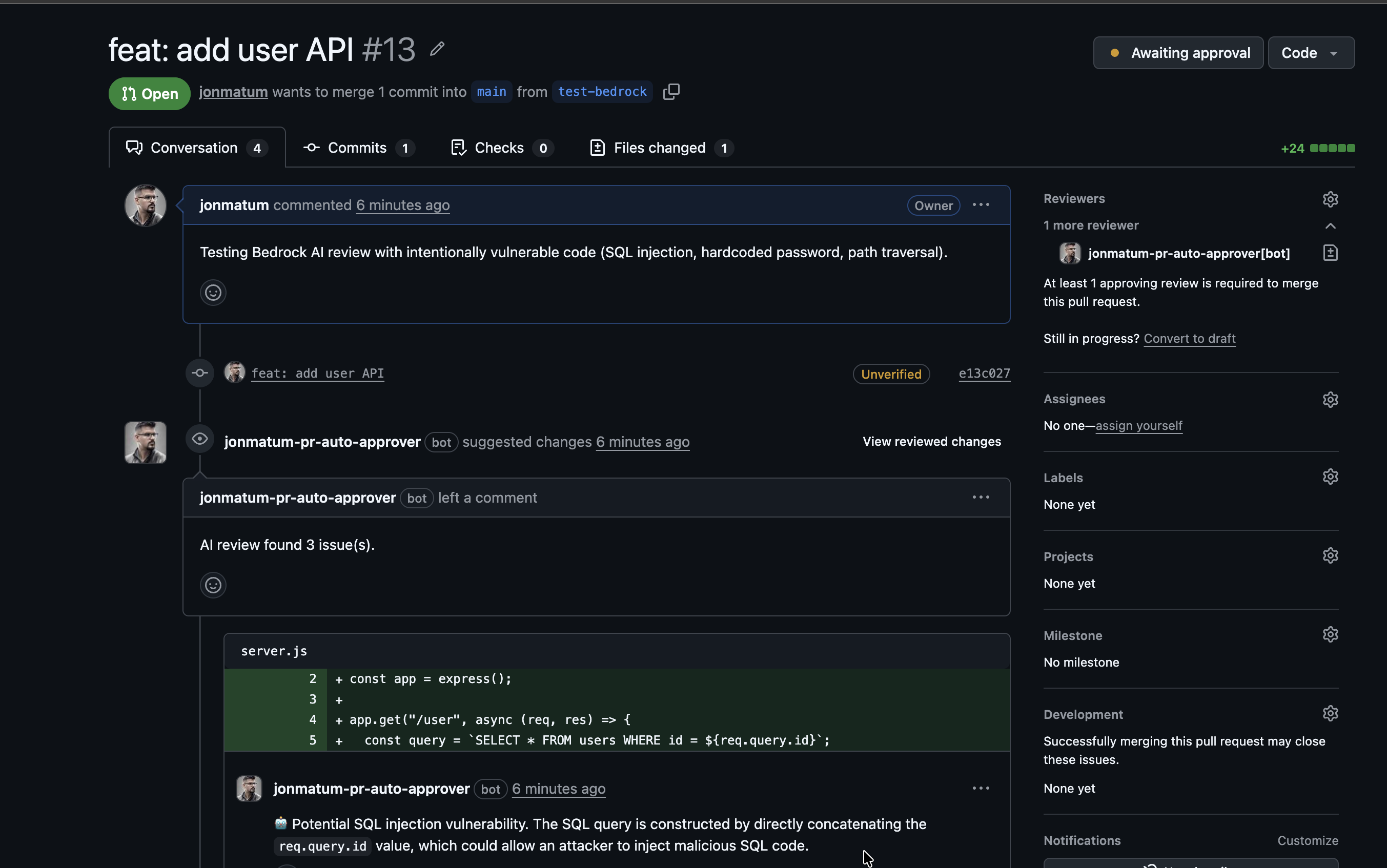 Cuando bedrock_enabled = true, Lambda envía el diff del PR a Claude 3 Haiku (configurable) antes de aprobar. En el screenshot, el bot detectó 3 problemas en código intencionalmente vulnerable — incluyendo una inyección SQL por concatenación directa de req.query.id — y solicitó cambios en lugar de aprobar. El modelo revisa: